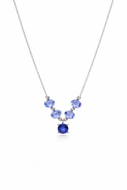 Collar con cadena de oro blanco y 4 zafiros cabujón y 1 zafiro central talla brillante con un largo total de 42cms y una anilla para poder poner a 40cms.