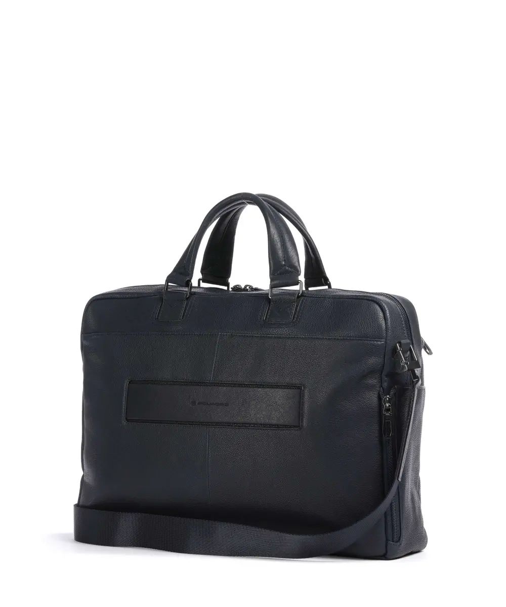 MaletinPIQUADRO con tres bolsillos delanteros y cremallera, sistema de fijación a trolley cierre de cremallera de dos vías dos manijas (caída 11 cm) una extraíble y ajustable correa de hombro (longitud cerca de 95-155 cm) herrajes de metal de color antracita Interior Revestimiento interno de polyester logo espacioso compartimento principal apto para documentos a4 bolsillo con bloqueo RFID, porta-plumas un bolsillo para cables de ordenador portatil, un bolsillo para un ratón óptico más de seis bolsillos interiores un compartimiento acolchado para computadora portátil Material: cuero de vaca graneado tamaño portátil: Adecuado para portátiles de hasta 15 pulgadas Tamaño: aprox. 41 x 30 x 10 cm (ancho x altura x profundidad) Peso: 1,3 kg Color del fabricante: blue