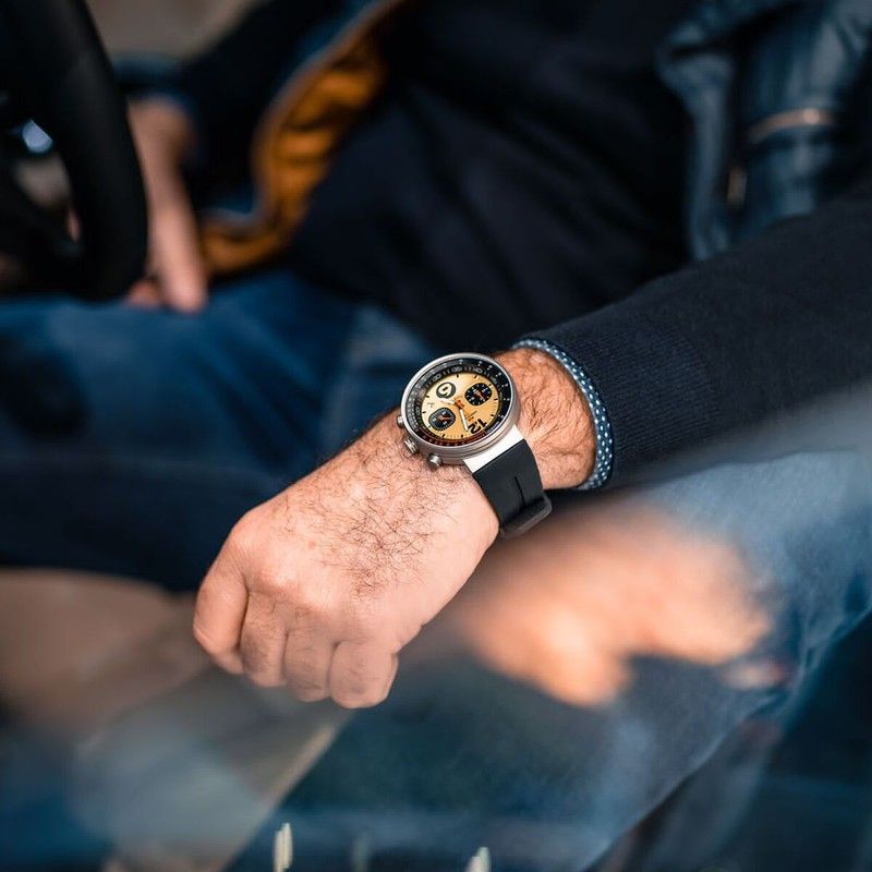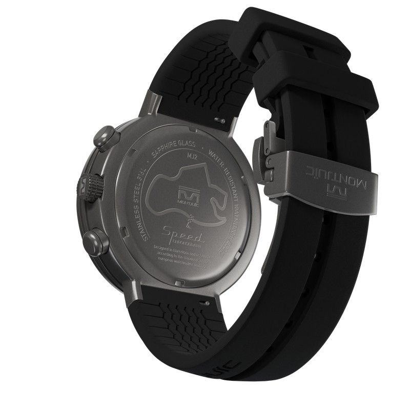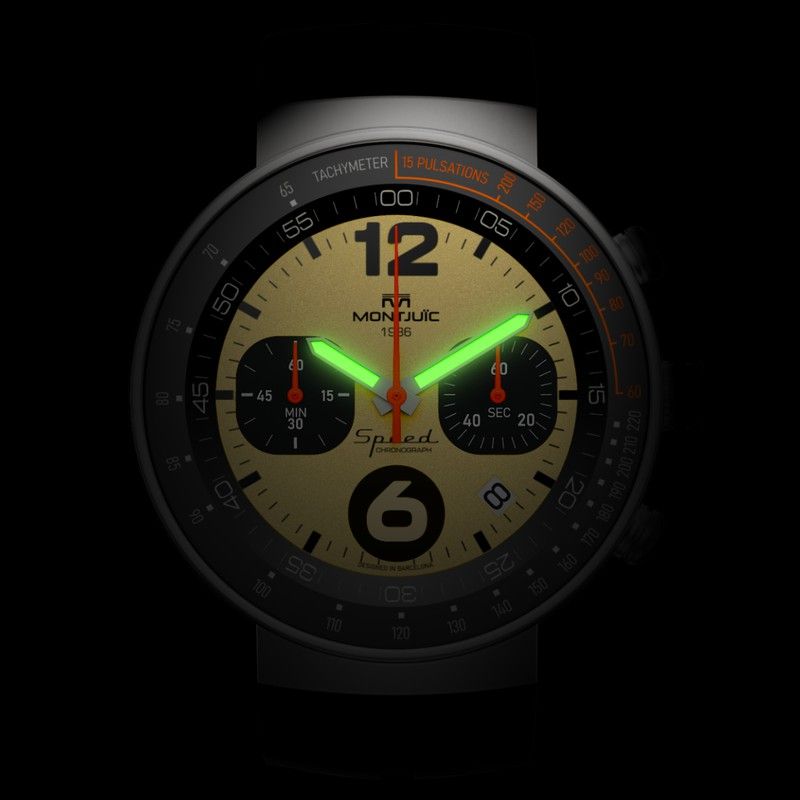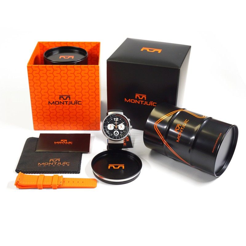 Caja de diseño único tipo pistón, de Ø 45 mm. Acero inoxidable acabado ‘Sandblasted’. Tapa de fondo a rosca en acero y corona moleteada con logotipo grabado. Cristal de zafiro, con tratamiento antirreflejos en cara interior. Esfera color oro, con partícula metálica. Índices y números aplicados en la esfera. Agujas horarias con luminiscencia Superluminova™. Movimiento personalizado Miyota® (Citizen Group®), con tecnología Mecaquartz. Con cronógrafo, sub-esferas minutos y segundos y fecha a las 16:30. Duración aproximada de la batería 3 años. Correa especial de silicona, cómoda y altamente resistente (disponible en 5 colores). Diseño específico patentado de patrón neumático en el interior para facilitar la transpiración. Sistema de intercambio rápido de correas, sin necesidad de herramientas. Cierre desplegable en acero inoxidable tipo mariposa, con pulsadores laterales de apertura, con acabado a juego con la caja. OTROS DETALLES Dial metálico ultral igero y multicapa. Bisel interior metálico. Pulsadores chrono con clásico click mecánico. Resistencia al agua 10ATM / 100 metros. CONTENIDO DE LA CAJA Reloj Montjuïch. Bidón metálico (válido como estuche de viaje). Gamuza para el cuidado del reloj. Tarjeta de garantía y acceso al manual de usuario mediante código QR.